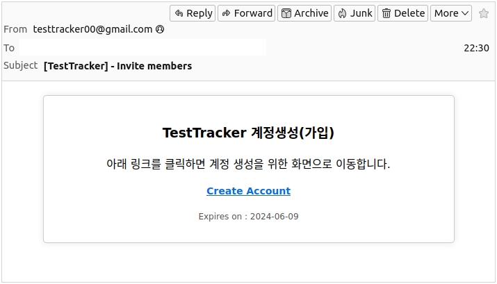 TestTracker 가입 절차는 TT-Admin으로부터 Invitation email 을 수신하는 것으로부터 시작됩니다. 해당 email 은 계정 생성 화면으로 이동할 수 있는 링크와 해당 링크의 유효기간을 나타내는 만료 일자를 포함합니다. 소속 기관 또는 기업 내 본인 이메일 수신함에서 아래와 같은 TestTracker Invitation email 확인 후 "Create Account" 링크를 클릭하시기 바랍니다.