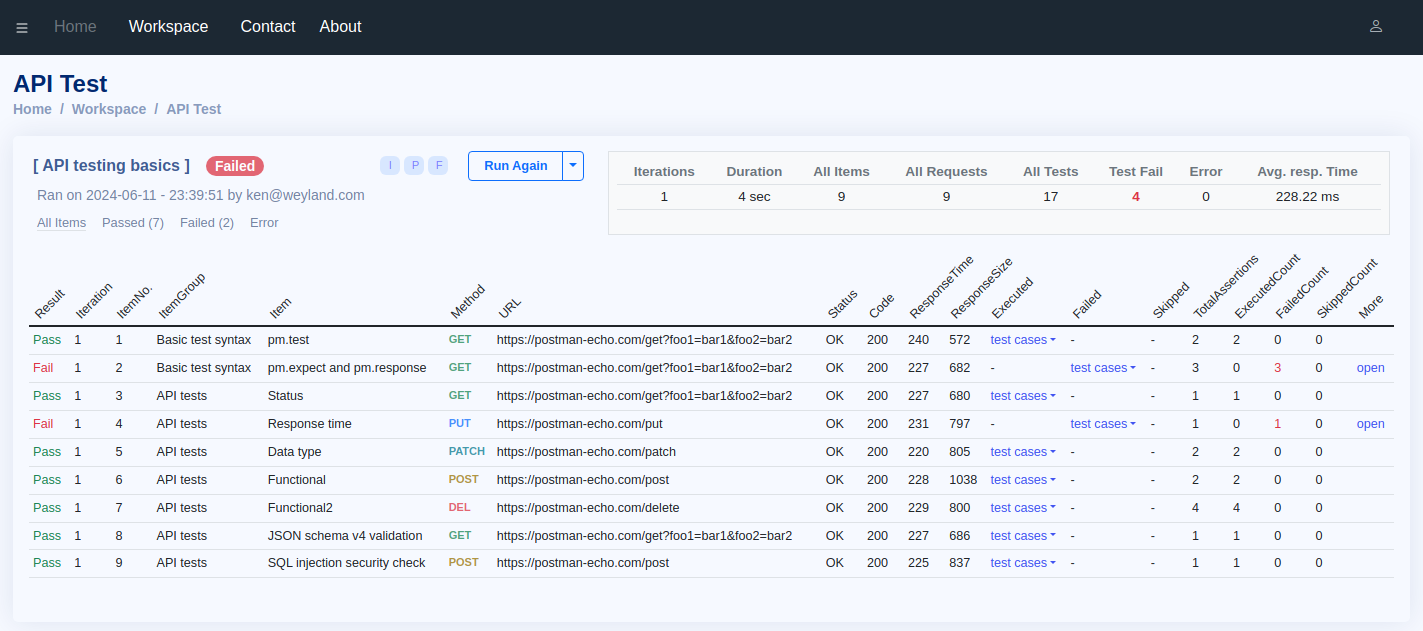 테스트 종료 시 시험 결과와 관련 통계가 업데이트되고, test item의 개별 실행 결과가 테이블의 형식으로 보고됩니다.